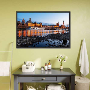 Elbe River At Night presents a panoramic riverfront skyline with historic domes and tall spires, boats, and strong water reflections. The realistic photographic image in blue, orange and gold tones feels serene, illuminated, and grand. It fits modern or classic interiors as a strong focal point for wall decor.