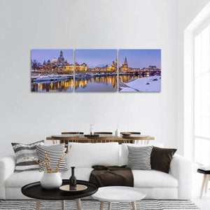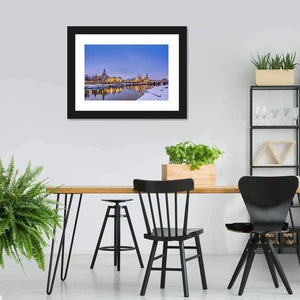 Photorealistic panoramic print of the Dresden skyline in winter, featuring domed buildings, snow-covered banks, boats, and a reflective river. Cool blue and white tones with illuminated windows create a serene, tranquil mood. Suited to modern living rooms or office walls as a calm focal piece.