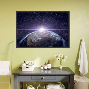 Experience the awe of Earth from space with this panoramic wall art. Featuring a serene sunrise over a glowing horizon, visible continents, and a vast starfield, this piece brings a cosmic charm to your space.