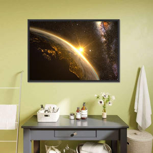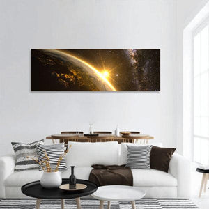 Experience the beauty of Earth from space with this panoramic view capturing a glowing sunrise. The serene night lights and vibrant palette evoke a cosmic atmosphere, making it an awe-inspiring addition to your décor.