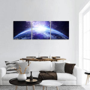 This stunning panoramic artwork captures the Earth from space, showcasing the galaxy and stars. With a vibrant palette of blue and purple, it evokes a cosmic and awe-inspiring atmosphere that’s perfect for adding a majestic touch to your decor.