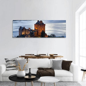 Eilean Donan Castle in Scotland is captured on a panoramic canvas, the stone castle with lit windows set against a dusky sky and calm water that reflects the scene. The realistic landscape uses warm oranges, cool blues and greys to create a historic, quietly dramatic atmosphere. Suits modern or traditional room decor, such as living rooms or studies that highlight scenic wall art.