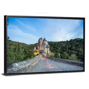 Eltz Castle in Germany appears in a panoramic, eye-level landscape framed by forest and a stone bridge. The green, brown and blue palette and a subtle circular light trail in the foreground create an enchanting, serene, majestic atmosphere that works well as a calm focal point in living rooms or hallways.
