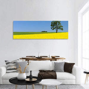Field Of Rapeseed Panoramic Canvas shows a sunlit rapeseed (canola) field of yellow flowers under a clear blue sky, with a lone deciduous tree and a small cluster of trees on the horizon. The photorealistic, modern composition uses horizontal depth and rule-of-thirds balance to create a serene, vibrant natural mood that suits contemporary living rooms or nature-inspired spaces.