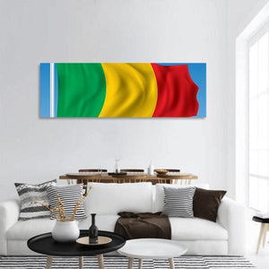 This canvas features the national flag of Mali in a modern panoramic composition that highlights a waving flag. Rendered in green, yellow, red and blue, the print carries a patriotic, kinetic mood and works well in contemporary rooms or modern decor.