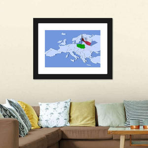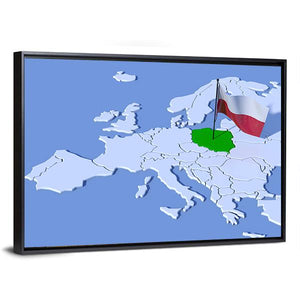 This panoramic canvas features the flag of Poland over a stylized 3D map of Europe, with Poland highlighted in green. Its modern, neutral presentation and blue, white, red and green palette suits contemporary living rooms or office spaces.