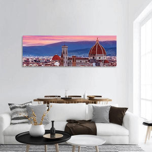 Florence City Skyline Panoramic Canvas shows the Florence skyline with the Dome of the Florence Cathedral, Giotto's Campanile and the Arno River at sunset. Rendered in soft pinks, blues and warm browns, the scene feels serene, romantic, and picturesque. It suits modern living rooms or bedrooms as a calming focal point.
