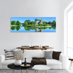 Forest Park, St. Louis presents a tranquil lakeside scene with a gazebo on a small island, framed by trees and a clear reflection in the water. Rendered realistically in a panoramic composition of blues and greens, this piece adds a calm, serene mood to modern or nature‑inspired rooms.