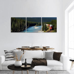 A realistic panoramic canvas showing a freight train with multiple cars beside a wide river and dense forest. The scene reads serene and vast, with blues and greens balanced by red, white, and brown accents. It fits modern or nature-inspired rooms as a calm, travel-focused focal piece.