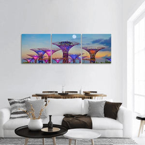 This panoramic canvas features illuminated, futuristic tree-like structures rising over gardens with a full moon in the night sky. A palette of blue, purple, orange, pink and yellow gives the scene a magical, futuristic glow that suits modern and contemporary rooms.