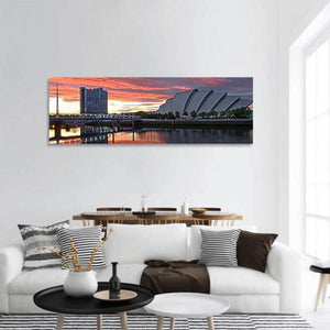 A panoramic cityscape of Glasgow Harbor at sunset, capturing the skyline, suspension bridge, and rippling river reflections. Its dramatic yet serene palette of orange, red, blue, gray, and white creates a vibrant, modern mood that suits contemporary living rooms or offices.