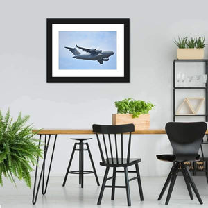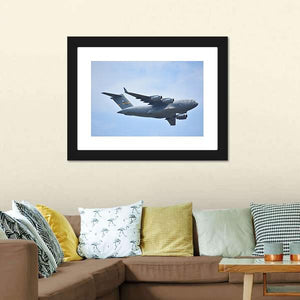 A photorealistic, wide-angle view of the C-17 Globemaster III airplane, showing U.S. Air Force markings and its four engines. Muted grays and blues with touches of white and yellow give the image a powerful, majestic mood. Suited to modern living rooms, offices, or aviation-themed spaces that favor realistic aircraft imagery.