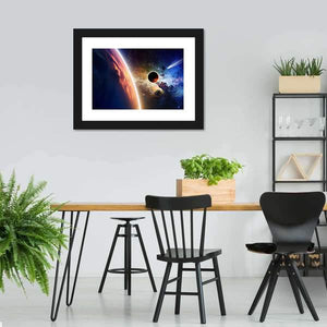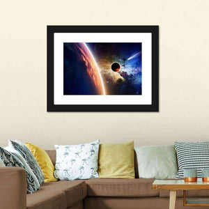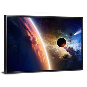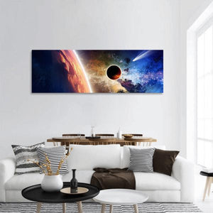 Comet & Glowing Planet Panoramic Canvas shows a glowing planet with atmosphere, a dark planet eclipsing a star, and a streaking comet set against a nebula-lit space. The abstract, modern palette of orange, red, blue, purple, and white creates a cosmic, vast mood that fits modern or astronomy-themed rooms.