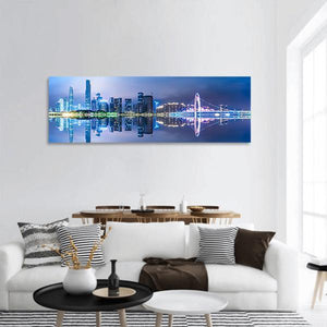 Guangzhou City Skyline Panoramic Canvas shows a nocturnal cityscape with illuminated buildings and an arched bridge reflected in calm water. The modern, vibrant blue-and-black palette creates a bold, contemporary mood. It suits modern living rooms or offices that favor panoramic wall art.
