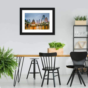 A panoramic view of the Guiyang city skyline, featuring an ornate pagoda, arched bridges, a river and both traditional and modern skyscrapers as dusk settles and lights reflect on the water. The realistic, colorful scene—blues, golds, greens, browns and whites—reads as vibrant, bustling and illuminated. It works well in living rooms, offices, or modern Asian-inspired spaces.