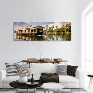 A photorealistic panoramic print of a Kerala houseboat on a calm river, surrounded by lush tropical foliage and a soft sky. The rule-of-thirds composition highlights the thatched roof and the boat’s reflection in tranquil water, creating a serene, peaceful mood. Works well in living rooms or studies.