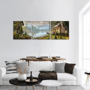This panoramic landscape shows a log cabin beside a calm lake, surrounded by trees, a wooden fence, and a flock of birds in flight; the cabin’s stone chimney and a light in the window add quiet detail. The eye-level composition uses atmospheric perspective and a palette of greens, blues, browns and grays to create a serene, peaceful, rustic mood. Pairs well with rustic or traditional interiors.