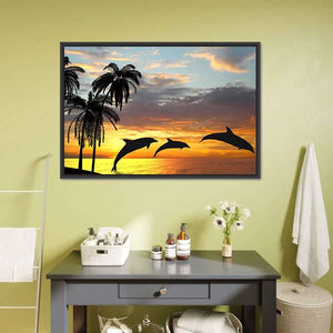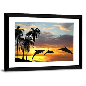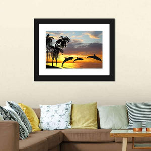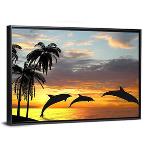 Dolphins Near Hawaii Panoramic Canvas captures silhouetted dolphins leaping by palm trees against a tropical sunset over the ocean. Warm oranges and yellows blend with purple and blue for a serene yet vibrant mood. Fits well in modern or coastal room decor such as living rooms, bedrooms, and entryways.