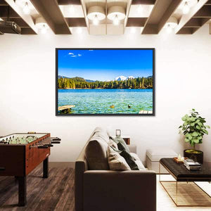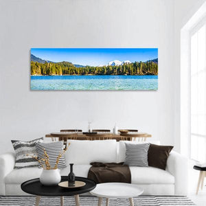 Lake Hintersee Panoramic Canvas shows a serene mountain lake with snow-capped peaks, a pine forest, and clear turquoise water in a wide, realistic composition. The calm blue, green and brown palette and majestic, natural mood suit modern or nature-themed rooms.