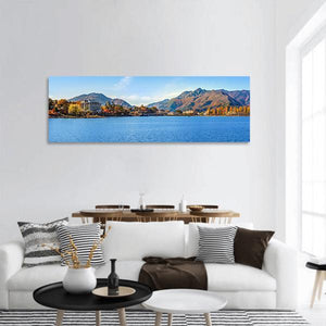 Lake Kawaguchi Japan Panoramic Canvas shows a serene lakeside scene with mountains, buildings, and tree-lined shores under a clear blue sky. Rendered in a realistic panoramic composition with calm water and autumn foliage in blue, green, and brown tones, it brings a picturesque, tranquil vibe to modern interiors.