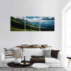 A realistic panoramic view of rolling green hills and distant mountains, with sunlight streaming through clouds. The scene feels serene and majestic, with shadows on the hillsides adding depth. It suits modern, nature-inspired rooms as calming wall decor.