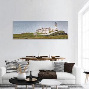 Neist Point Lighthouse, Scotland — a photorealistic canvas of a lighthouse on coastal cliffs with red-roofed buildings and the open sea. The muted palette of gray, green, blue and white creates a calm, serene coastal mood. Suited to living rooms, entryways, or coastal and modern decor.