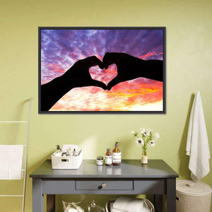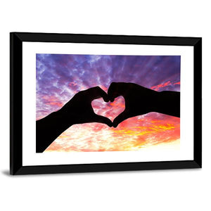 Silhouetted hands form a heart against a sunset sky, rendered in purple, pink, orange and black for a romantic, serene, hopeful mood. This panoramic canvas print suits modern rooms and provides a colorful focal point for living rooms or bedrooms.