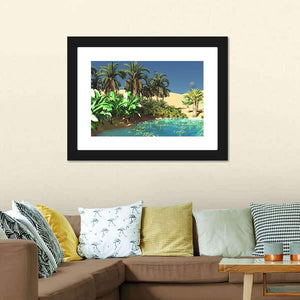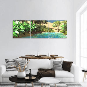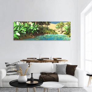 A wide panoramic view of a tropical Arabic beach oasis with palm trees, dunes, water and lily pads. Rendered in a realistic, vibrant palette of green, blue, tan and brown, it gives a tranquil, refreshing atmosphere. Suits modern or nature-inspired rooms as a calming focal piece.