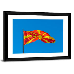 This panoramic canvas features the Macedonian flag with its yellow sun and rays, rendered in bold red and yellow with hints of blue for a vibrant, patriotic mood. The modern, graphic composition follows the rule of thirds and suggests motion across the image. Suits modern room decor as a colorful wall art focal point.