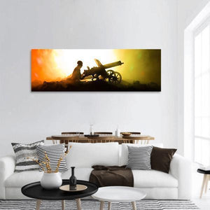A panoramic canvas showing a silhouetted soldier beside a vintage cannon, set against smoke and a simulated explosion. Rendered in orange, yellow, brown and black, the image carries a dramatic, intense historical mood that suits vintage or military-themed wall decor.