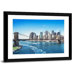 This panoramic canvas features the Manhattan skyline and the Brooklyn Bridge in a wide, low-angle view over the East River. Photorealistic, modern tones of blue, gray, brown, and white show boats on the water beneath a clear blue sky, creating a vibrant, dynamic urban mood. It suits modern interiors such as living rooms and lofts.