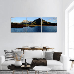 Mount Rundle and Vermilion Lake appear in a panoramic canvas, with mountains, a calm lake, trees and a cloud-strewn sky that read as serene and majestic. The cool blues, greens and soft browns bring a peaceful, natural feel that suits modern living rooms or home offices.