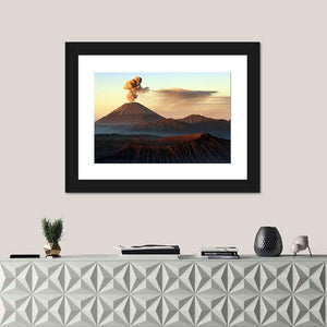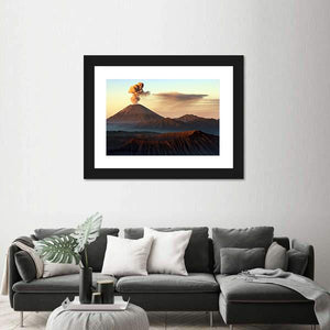 Semeru Volcano, Indonesia is captured in a panoramic, realistic landscape showing volcanic smoke and layered mountain ranges. Warm oranges and browns blend with blues and greys to create a dramatic, awe-inspiring sunset atmosphere. It suits modern or nature-inspired interiors as a bold focal piece.