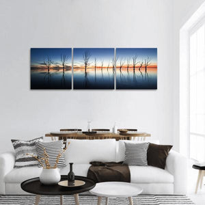 Mystic Lake Panoramic Canvas Wall Art shows bare trees rising from calm water beneath a warm sunset sky, with clear reflections across the lake. The panoramic, symmetrical composition creates a serene, contemplative mood. It pairs well with modern, minimalist rooms such as living rooms, bedrooms, or offices.