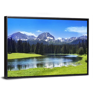 A panoramic canvas of Durmitor National Park featuring snow-capped mountains, a reflective lake, dense pine forest and a grassy meadow. The realistic landscape feels serene and majestic, a calm nature-focused piece that suits nature-themed or modern interiors.
