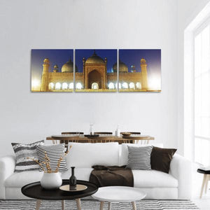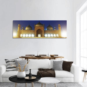 This panoramic canvas captures the Badshahi Mosque in Lahore, showing its domes and minarets beneath a serene night sky with illuminated windows. Rendered photorealistically in blue, gold, brown, and white, the print brings a majestic, calm presence that fits modern room decor.