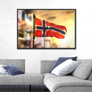 A sunlit Norwegian flag rendered in bold red, blue and white brings a vibrant, patriotic feel to this panoramic canvas. The image balances realistic and graphic detail with a rule-of-thirds composition, making it suitable for modern living spaces and room decor.