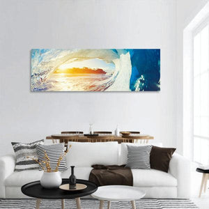 This panoramic canvas captures the awe of an ocean wave crashing at sunrise. The dynamic blend of blue, orange, and white hues evokes a serene yet powerful atmosphere, perfect for adding a touch of nature to your wall decor.