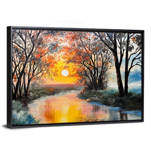 A panoramic oil painting of a riverside landscape at sunset, with trees and the sun casting a warm glow across the scene. Thick, painterly brushstrokes and a palette of orange, yellow, green, blue, and brown create a serene, warm atmosphere that fits modern living rooms and bedrooms.