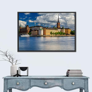 This panoramic cityscape captures a tourist ferry and waterfront buildings on Lake Malaren, featuring a red brick church tower with spires and a white boat in the foreground. Rendered in a realistic, photographic style with a bright, serene palette of blues, whites and warm earth tones, it suits modern interiors and room decor.
