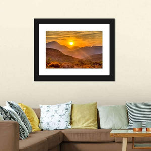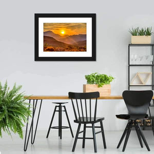 A panoramic mountain range washed in orange sunset light, with a bright sun disc and visible sunbeams through a soft haze. The photographic, realistic scene reads serene and majestic, with warm orange, purple, brown, and yellow tones. Works well as modern wall decor in living rooms, bedrooms, or offices.