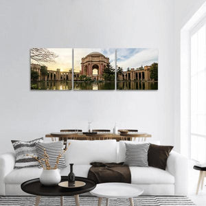A panoramic photographic canvas of the Palace of Fine Arts in San Francisco, showing the domed classical building and its reflection on calm water. Gold, green and blue tones create a serene, picturesque mood that pairs well with modern or traditional décor.