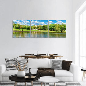 This panoramic canvas captures the pond, trees, benches and fluffy clouds at the National Mall in Washington, presented in a photo-realistic summer park scene. Soft greens and blues with clear reflections in the water create a peaceful, serene yet vibrant mood. Suits modern living rooms or offices as subtle room decor.