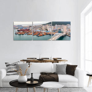 An aerial panoramic view of the Port of Busan and the Busandaegyo Bridge, showing a busy industrial harbor filled with cargo ships and a sweeping cityscape in blues, oranges, greys, and whites. The realistic, modern canvas conveys the expansive, daytime mood of a working port. It fits modern or industrial rooms and serves as a focal piece for living rooms or offices.