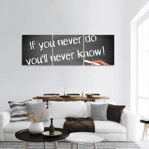 Centered black-and-white typography featuring the quote If you never do you'll never know. The chalkboard texture and a hand holding chalk create a modern, minimalist, and thought-provoking look that suits modern or minimalist interiors.