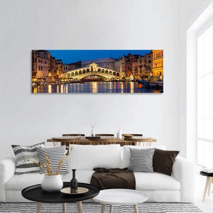 Rialto Bridge on Venice’s Grand Canal is captured in a panoramic, photorealistic canvas that highlights the arched bridge, buildings and boats. Evening lights and water reflections create a vibrant, romantic, illuminated scene in blues, yellows, browns and whites. A colorful choice for modern rooms and shared spaces as wall decor.