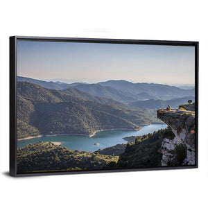 This realistic panoramic canvas captures a winding river and lake cradled by soaring mountains, with a lone person standing on a cliff in a wide daytime view. The cool blue‑green and earth-toned palette creates a serene, awe-inspiring mood that works well in modern, nature-inspired rooms like living rooms, offices, or entryways.