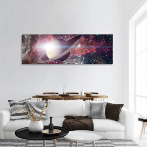 Saturn And His Ring System shows a glowing Saturn and detailed rings set against a colorful nebula of purple, pink, blue, white and black, creating a cosmic, awe-inspiring scene. The modern, abstract look works well in contemporary living spaces and offices that welcome vibrant, majestic artwork.
