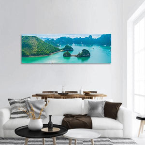 Capture a serene, exotic view of Halong Bay with this panoramic canvas showing limestone karsts and lush tropical islands rising from turquoise water. The photorealistic scene highlights clear, calm water and numerous small boats dotting the bay, creating a vast, peaceful atmosphere. Suited to modern room decor, it works well in living rooms or offices.