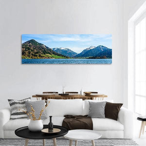 Schliersee Lake in Bavaria unfolds across a panoramic modern canvas, showing calm water, rolling green hills, and snow-capped peaks under a clear sky. The scene feels serene and majestic, with cool blues and greens that suit modern living spaces and room decor.